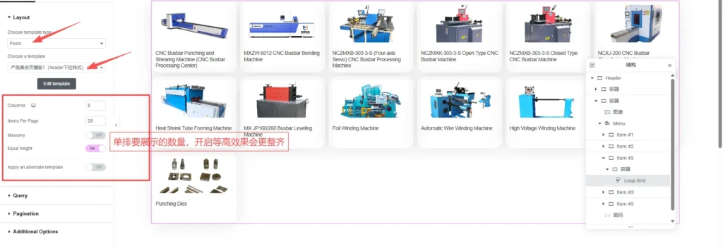 进入header页面或者你要使用Loop Item的容器,选择Loop Item小组件,Choose template type选择Posts,Choose a template搜索你刚才命名的模版,当你后台上传了产品以后,这里就展示出来了,然后来回调整为自己想要的效果。