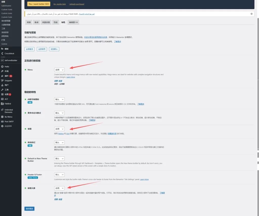 第二步:进入Elementor 设置的【特性】中,找到menu、容器、嵌套元素状态更改为启用,保存设置。