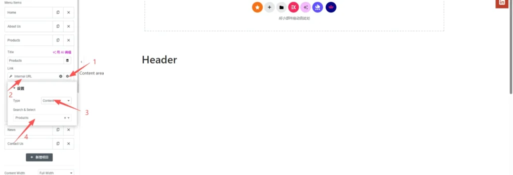 加入链接,不建议使用固定链接,后续有更改比较麻烦,链接选项中选择:Internal URL,然后点击它,会出现设置框,选择Content,在下方输入你要链接的页面。